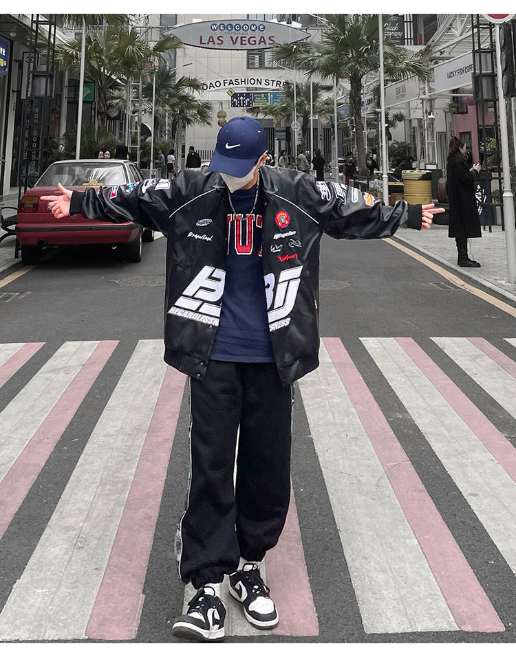 Elevate your style with the BJHG Polyester Jacket, featuring a modern stand collar and a secure press-stud closure. This jacket is designed for both comfort and flair, showcasing welt pockets for practicality and embroidery and graphic patches that add a unique touch. The embroidered logo appliqué at the front and silver-tone hardware enhance its contemporary look.