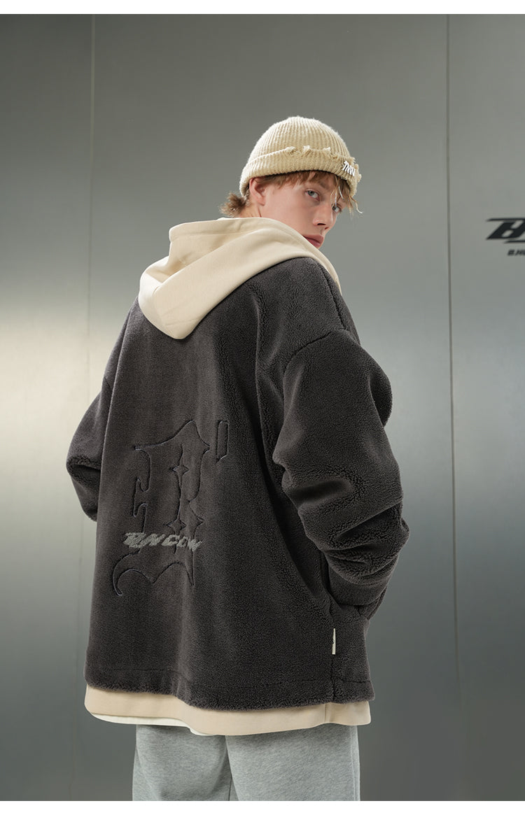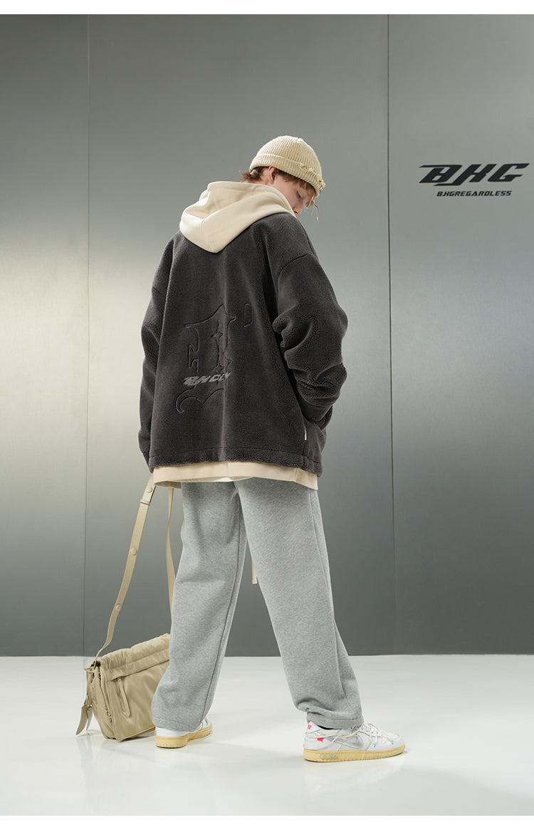 Designed with dropped shoulders for a relaxed silhouette, it features a button and zip closure for versatile wear. Keep your essentials secure in the welt pockets, and show off your style with the embroidered logo patch at the front and back.