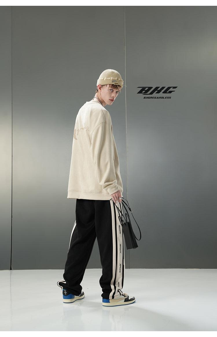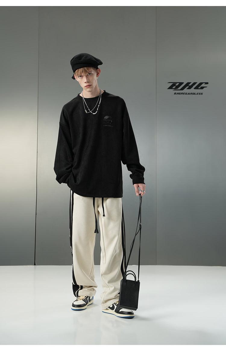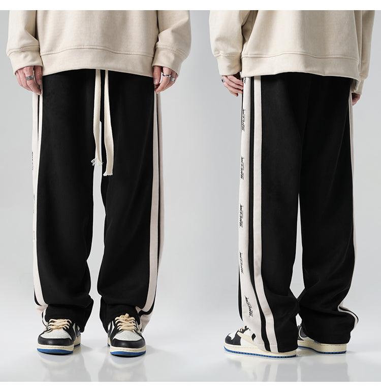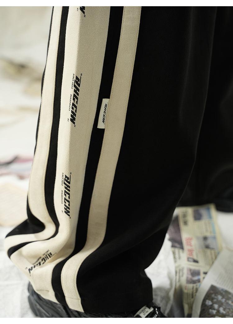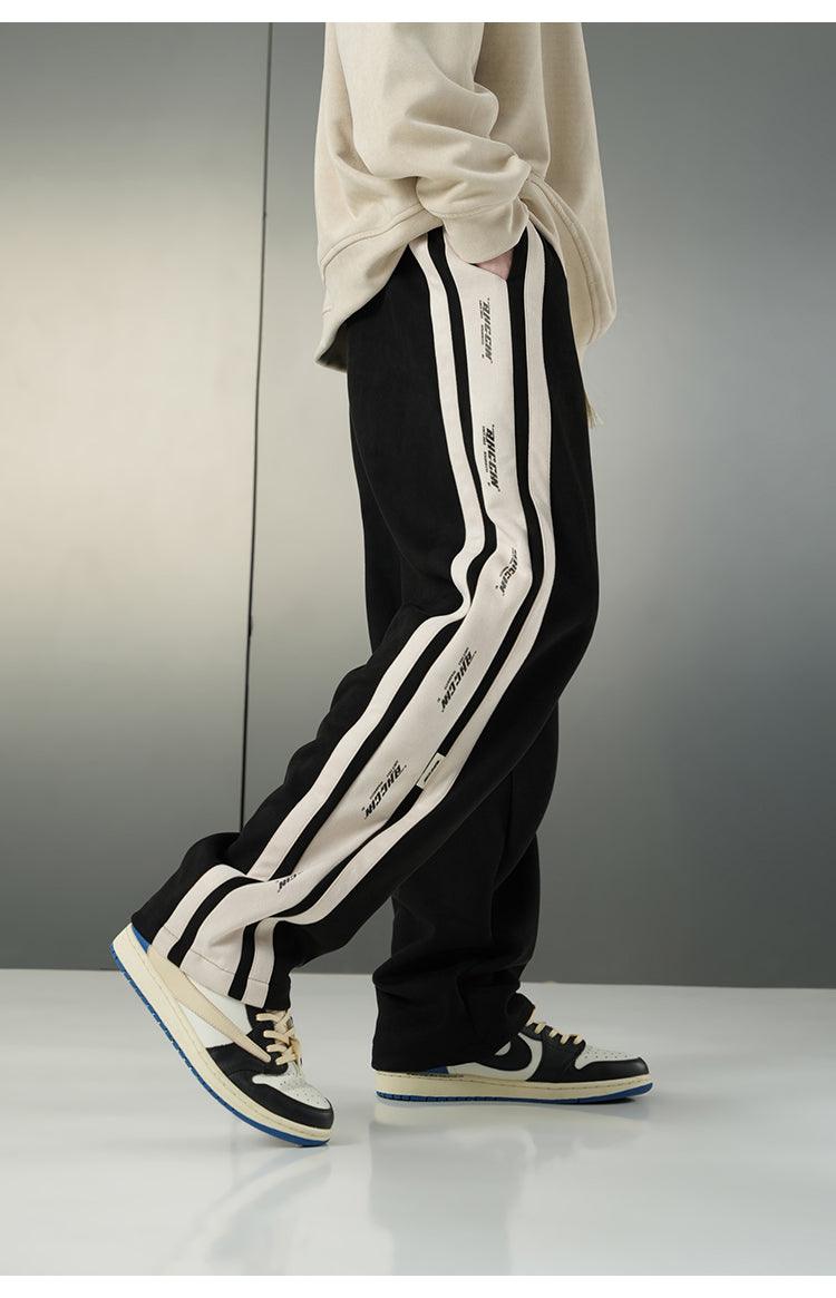 Stylish parallel suede track stripes add a touch of sophistication, while the open straight/finished hem bottoms ensure a modern silhouette. Crafted from a velour blended material, these pants offer both luxury and durability.