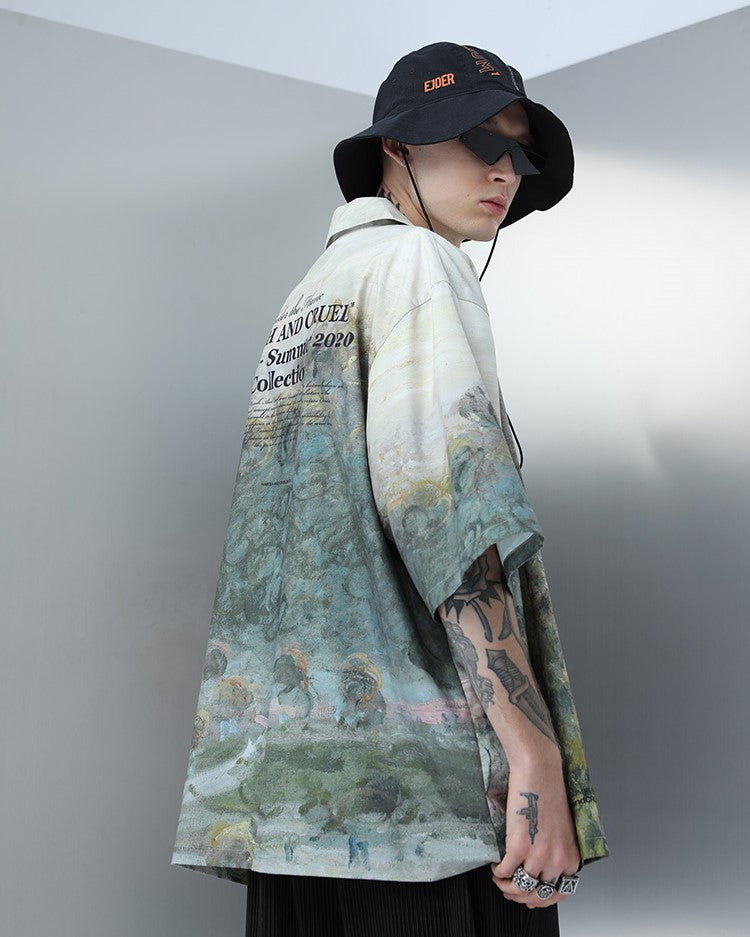 Introducing the HARSH and CRUEL Polyester Short Sleeve Shirt, a stylish addition to your wardrobe. Featuring a vibrant scenic graphic print throughout, this shirt is designed for those who dare to stand out.