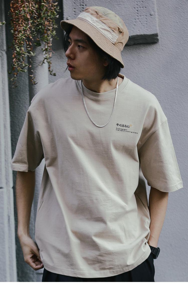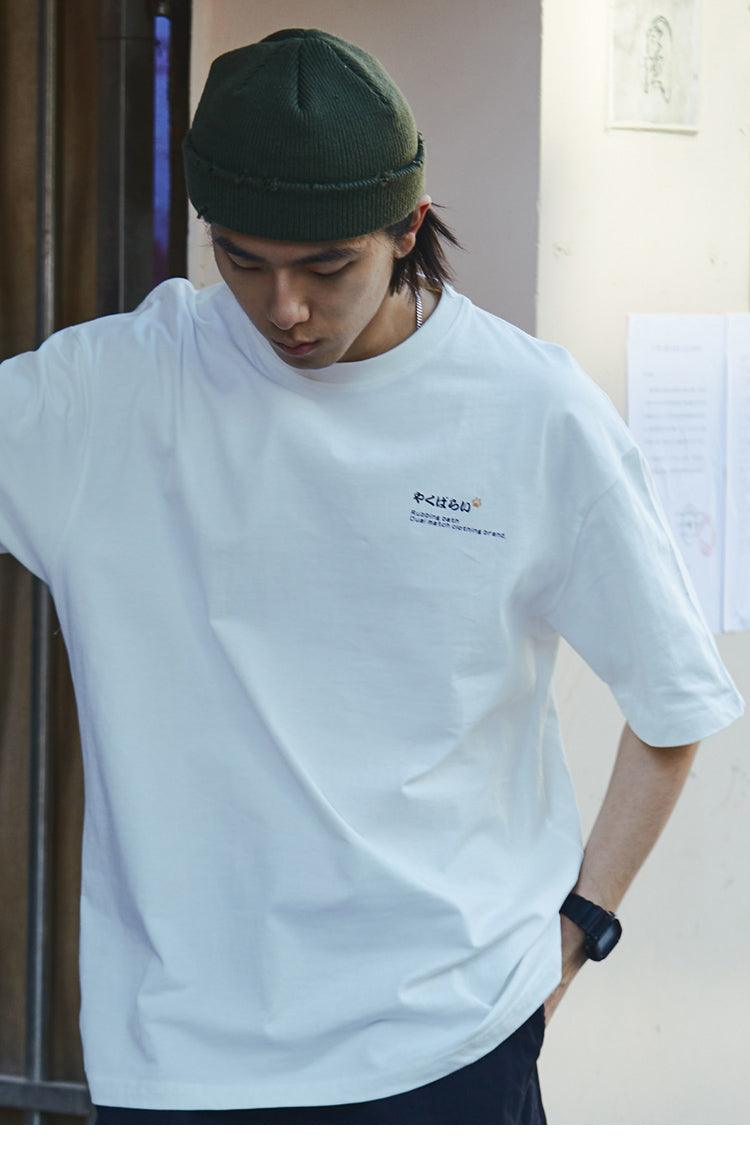Elevate your casual style with our cotton short sleeve shirt, featuring a comfortable rib knit crewneck, hem, and cuffs. The eye-catching kanji print at the chest adds a unique touch, while the playful cat graphic on the back makes it a standout piece.