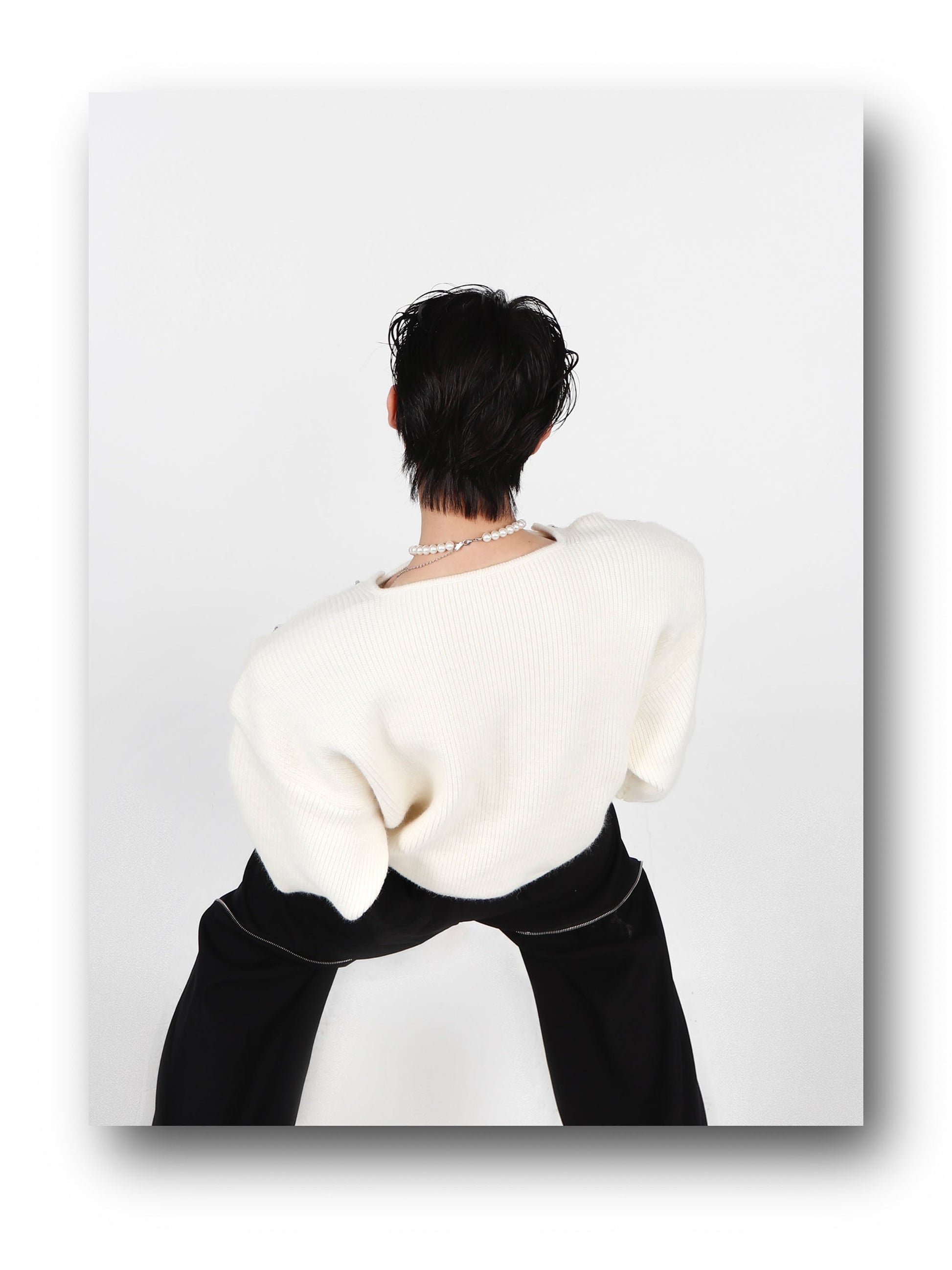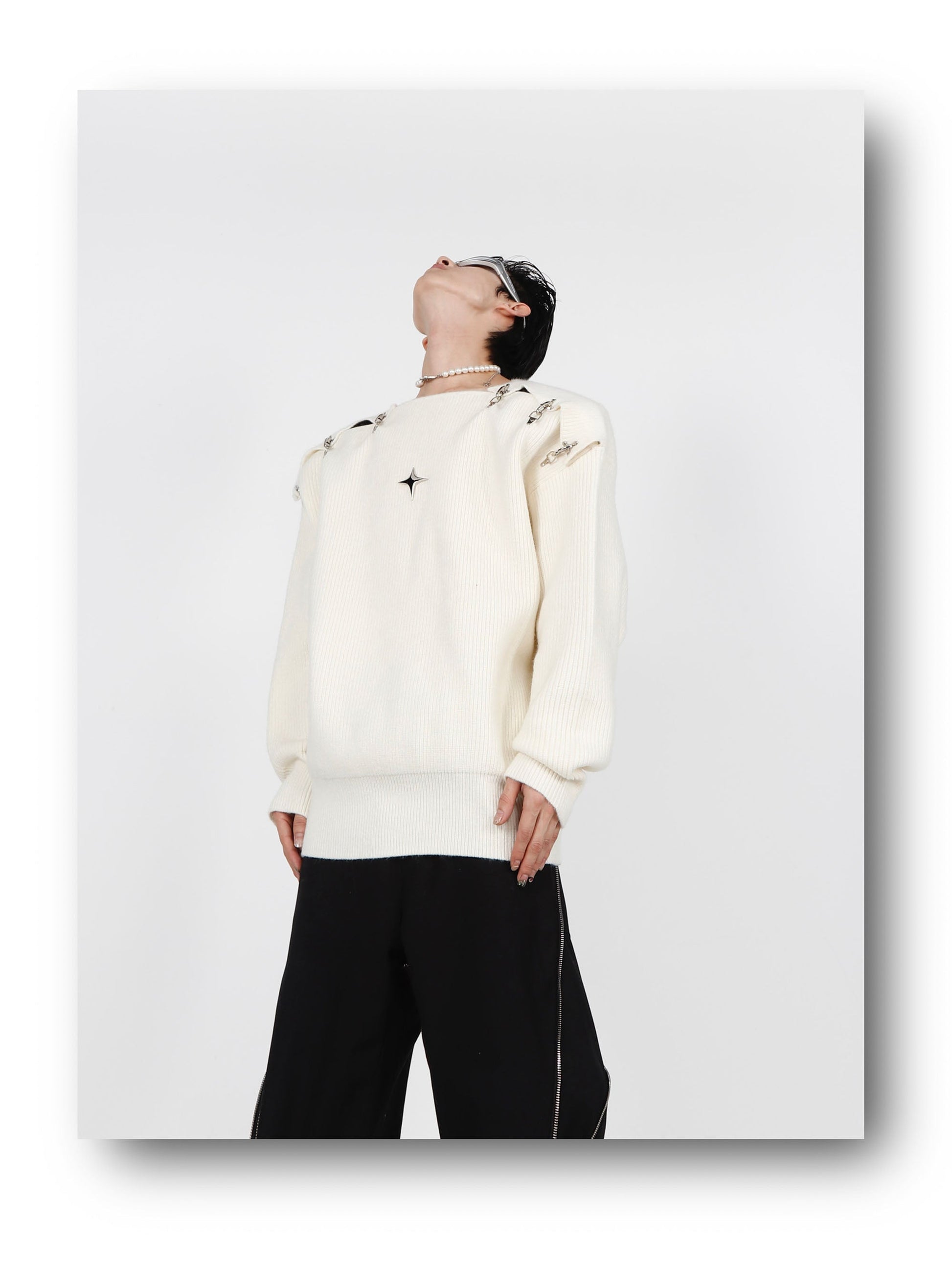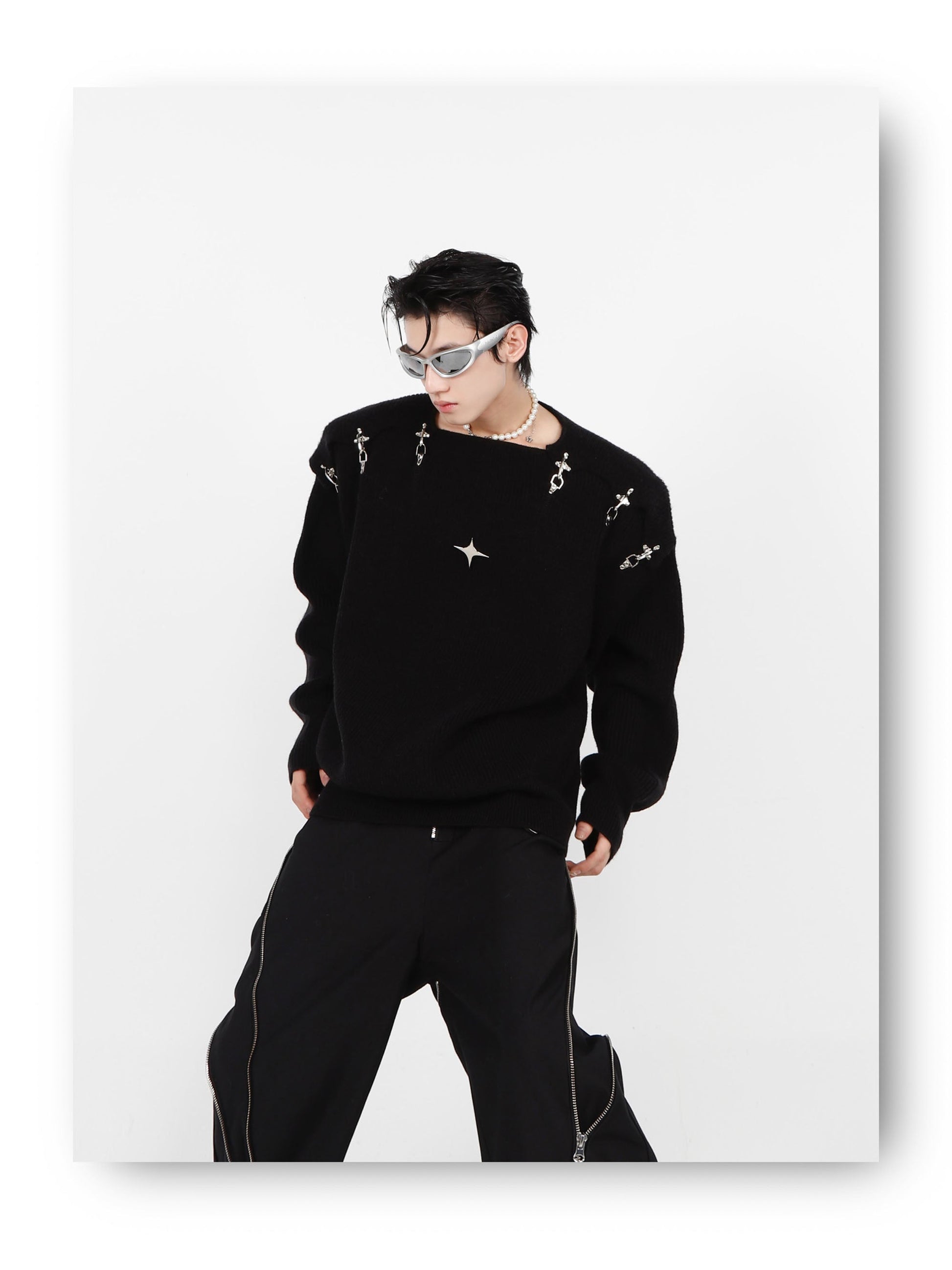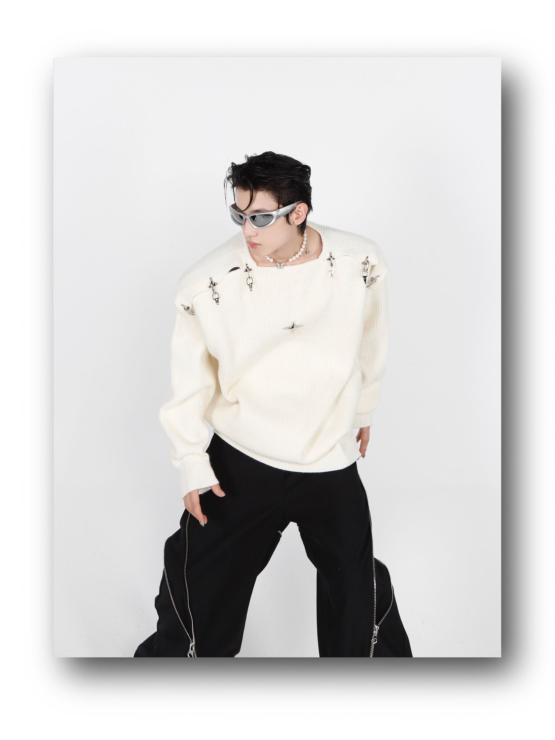 Elevate your wardrobe with the CulturE cotton blend sweater, designed for both style and comfort. Featuring a rib-knit hem and cuffs, this sweater boasts dropped saddle shoulders and a chic square neck for a modern look. The unique metal hardware at the chest and attached clips at the shoulders add a touch of sophistication.