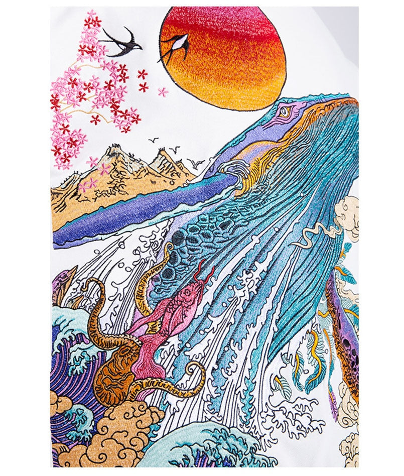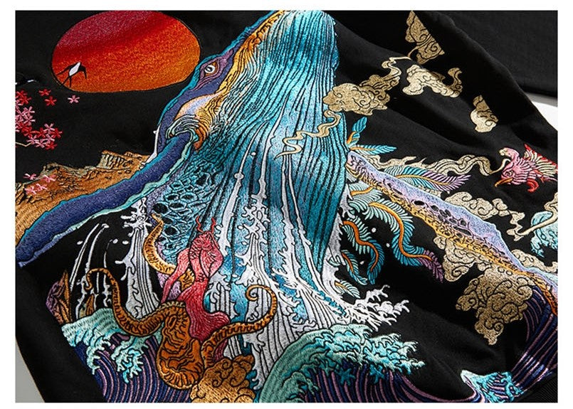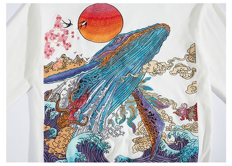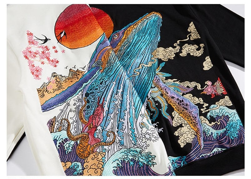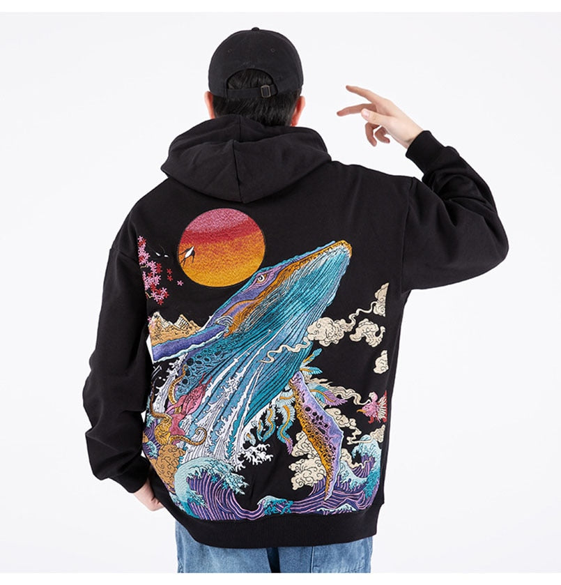 This stunning hoodie features a script embroidered logo on the chest and a beautifully detailed whale design on the back, complete with waves, clouds, and the sun in vibrant colors.
