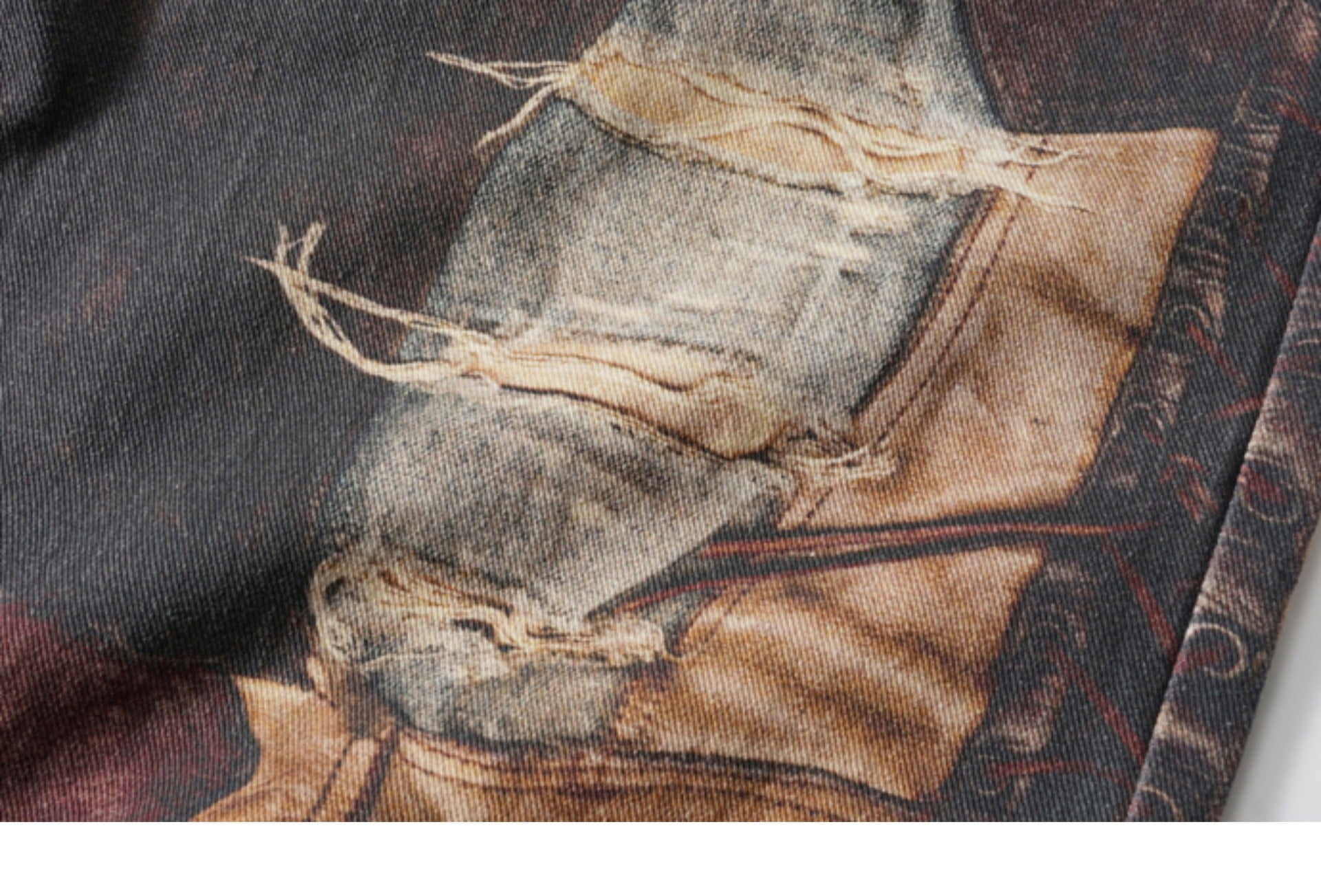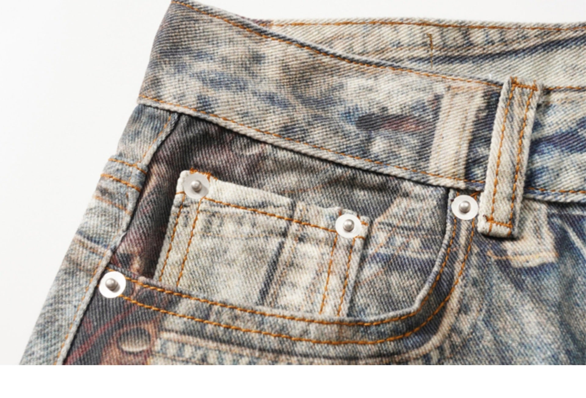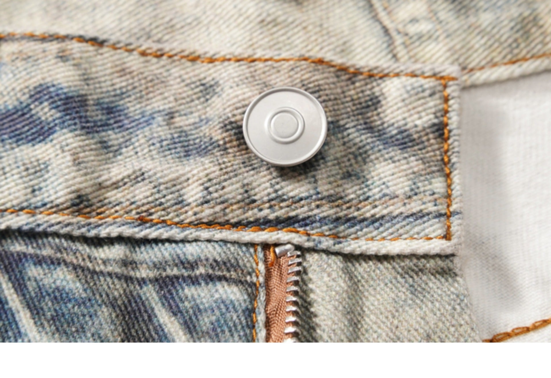 Elevate your style with our wide-leg cut and sew denim jeans, featuring a unique patchwork faux-leather design and custom dye fading for a one-of-a-kind look. These jeans are adorned with eye-catching printed graphics throughout, making them a standout addition to any wardrobe.