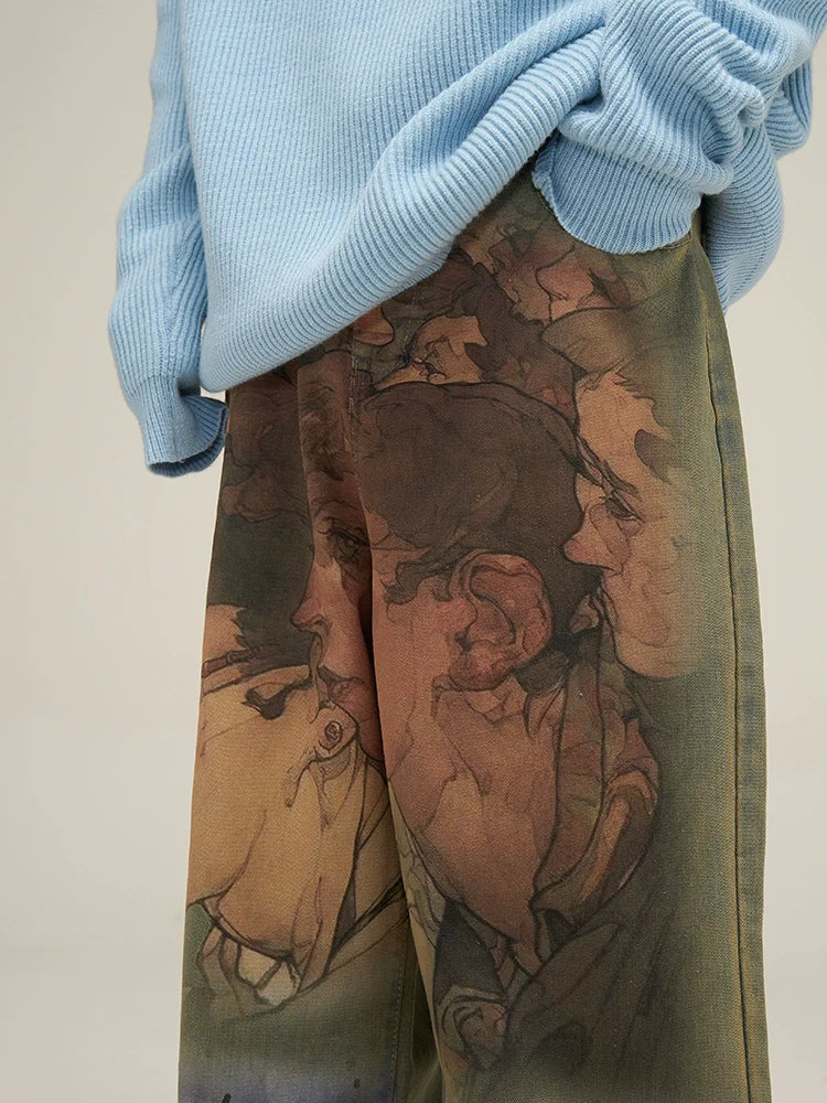 Elevate your style with our wide-leg denim jeans, featuring a trendy fade and eye-catching graphics printed at the front.
