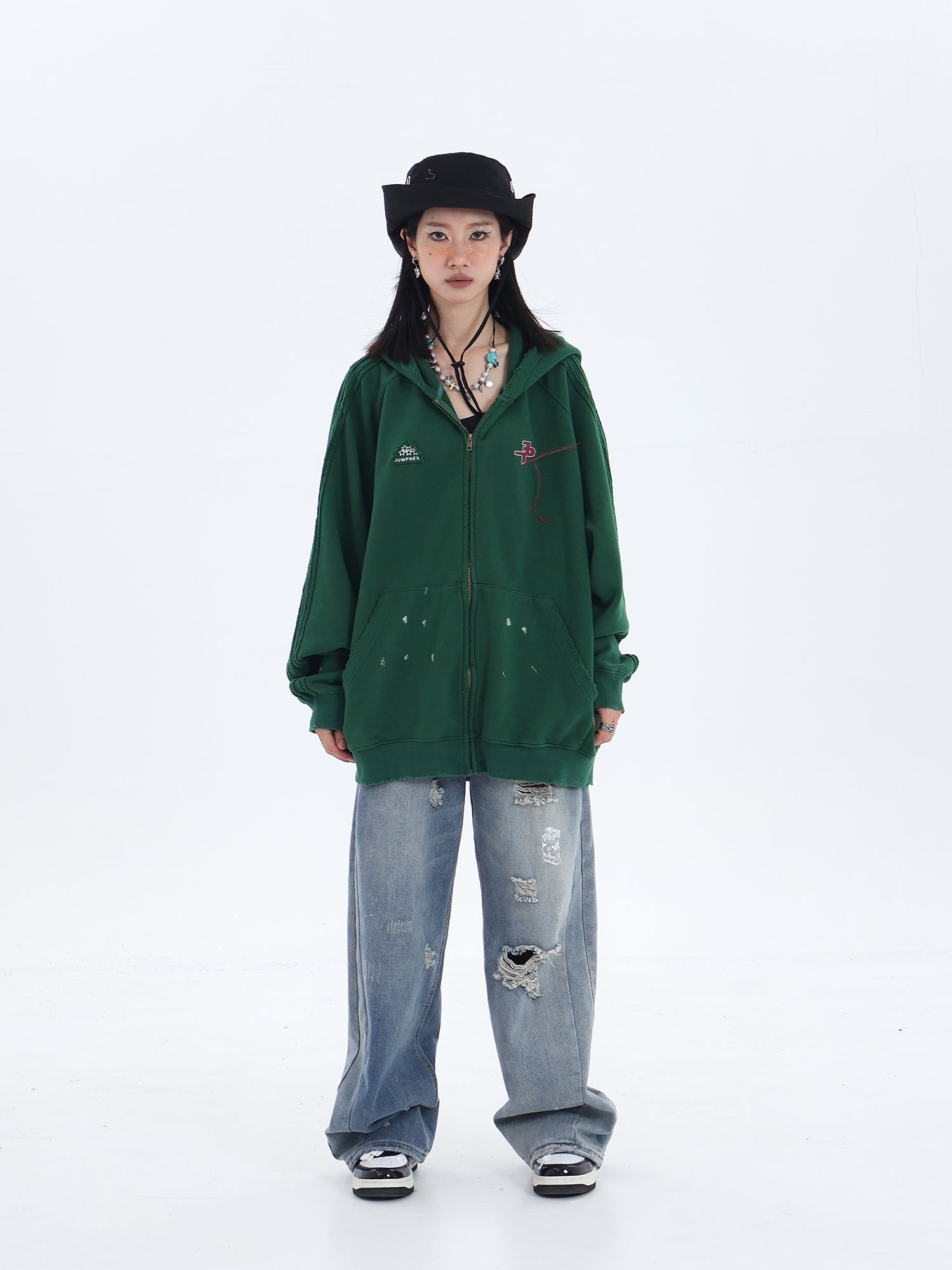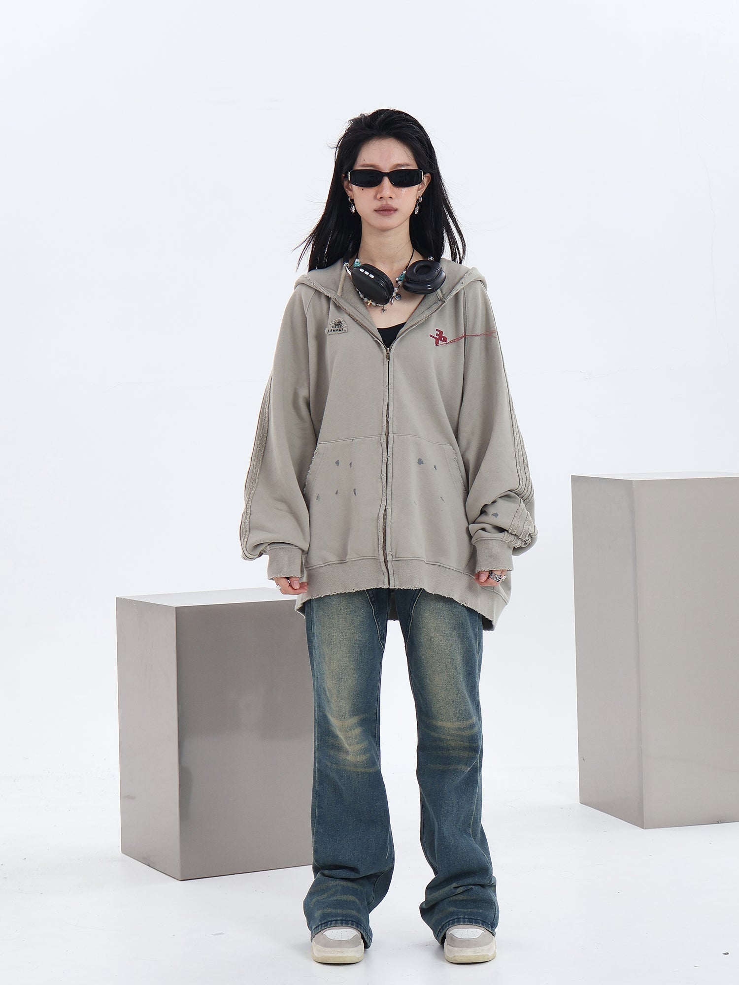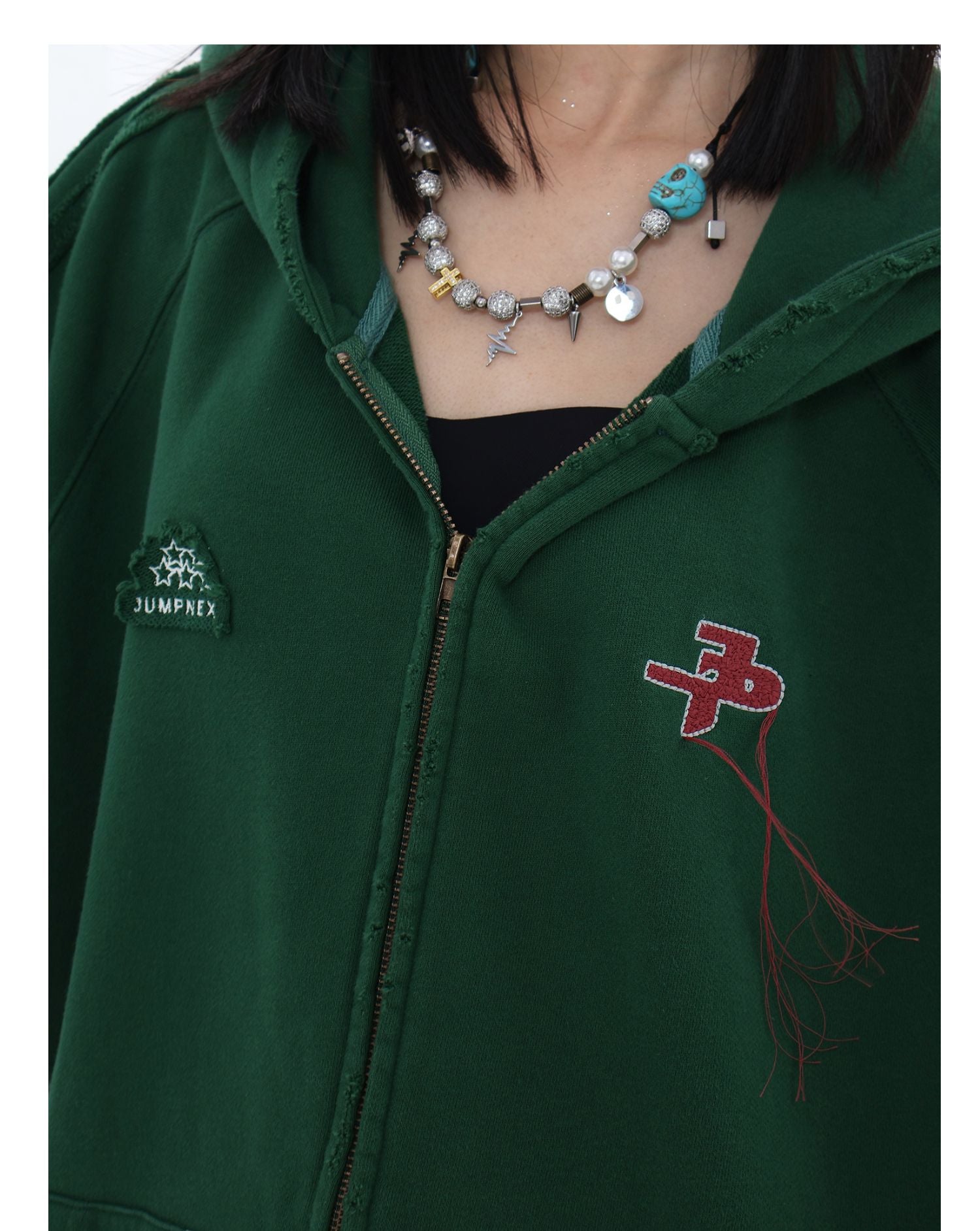 Elevate your style with the JUMPNEXT Zip Up Jacket, featuring eye-catching silver tone zip hardware and embroidered logos on the chest. The jacket boasts a unique custom distressing throughout, complemented by striped embroidery design on the sleeves.