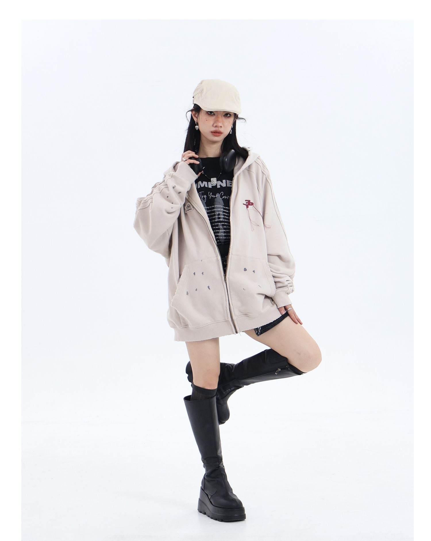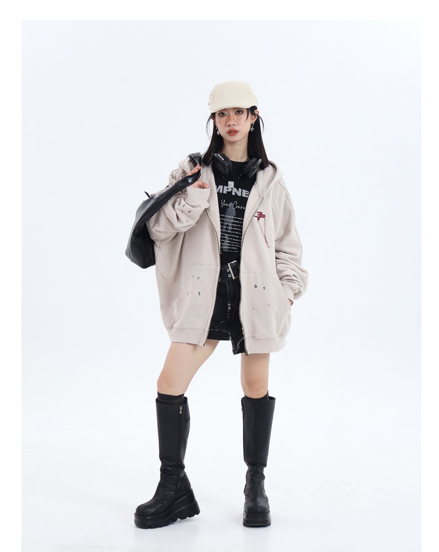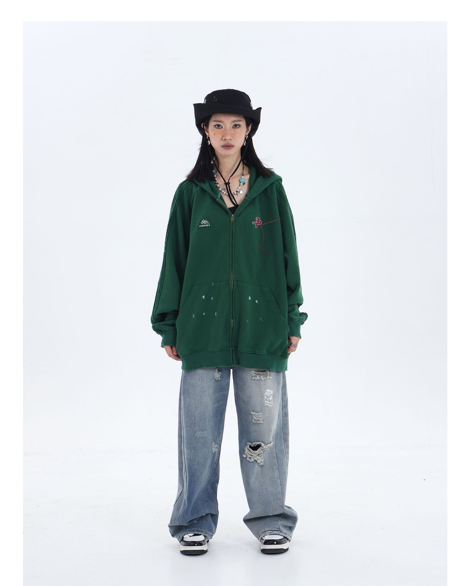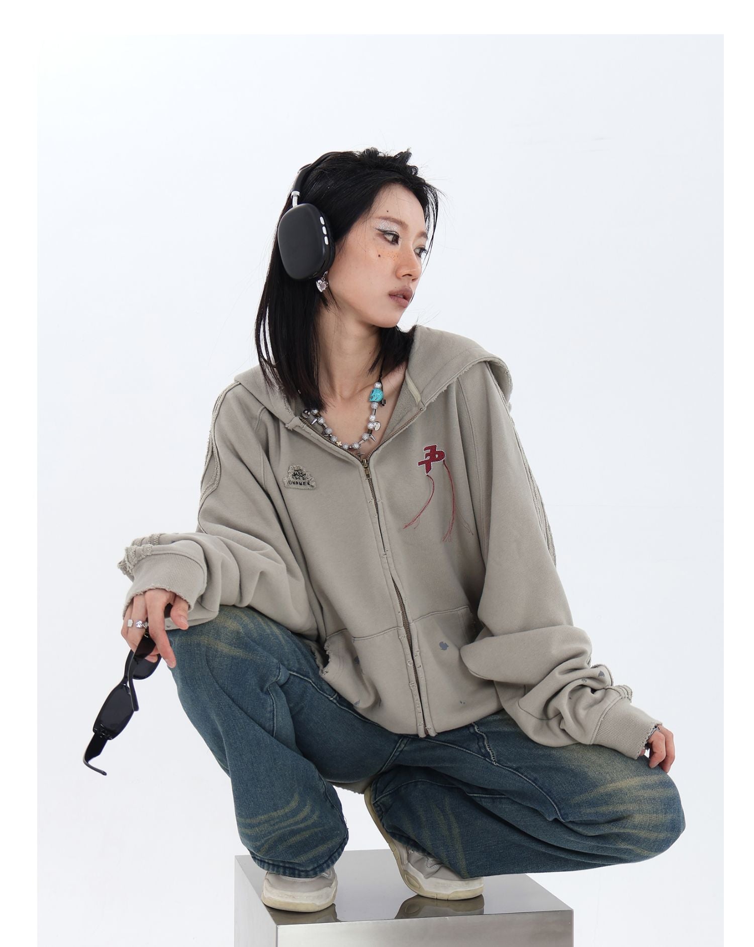 Elevate your style with the JUMPNEXT Zip Up Jacket, featuring eye-catching silver tone zip hardware and embroidered logos on the chest. The jacket boasts a unique custom distressing throughout, complemented by striped embroidery design on the sleeves.