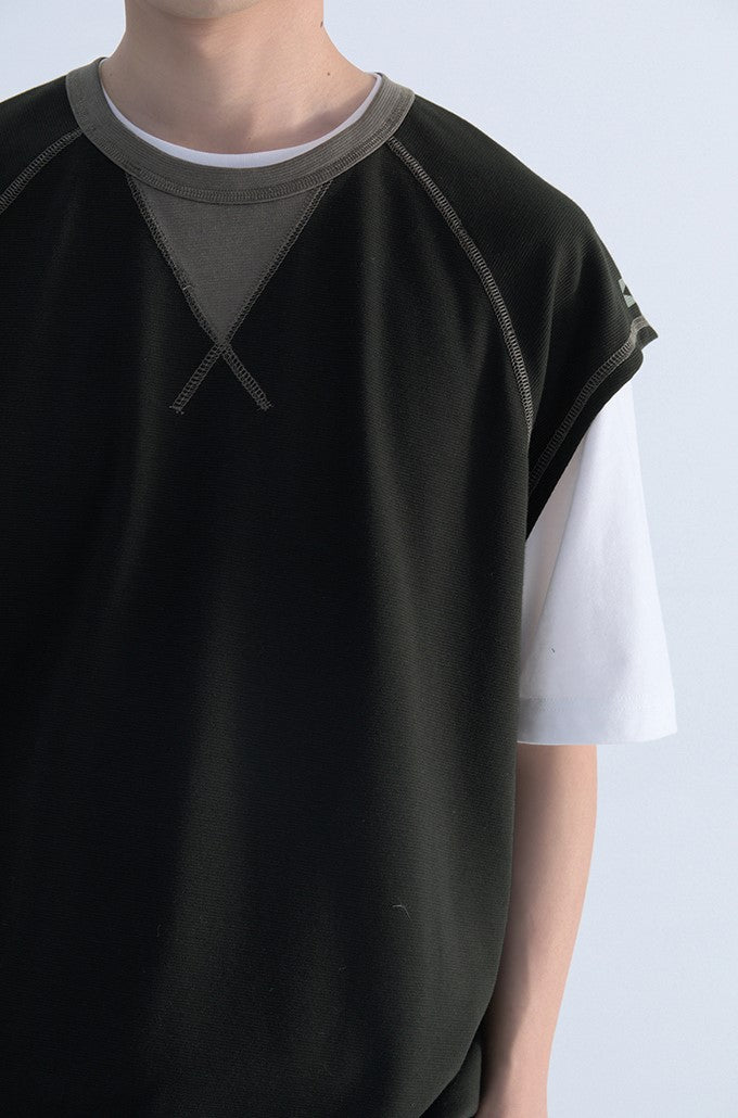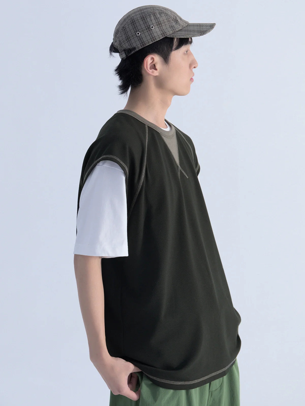 Introducing the Mentmate Cotton Sleeveless Shirt – your perfect blend of comfort and style. Featuring contrast stitching throughout, this shirt boasts a rib knit V-neck and a stylish hem for a modern look.