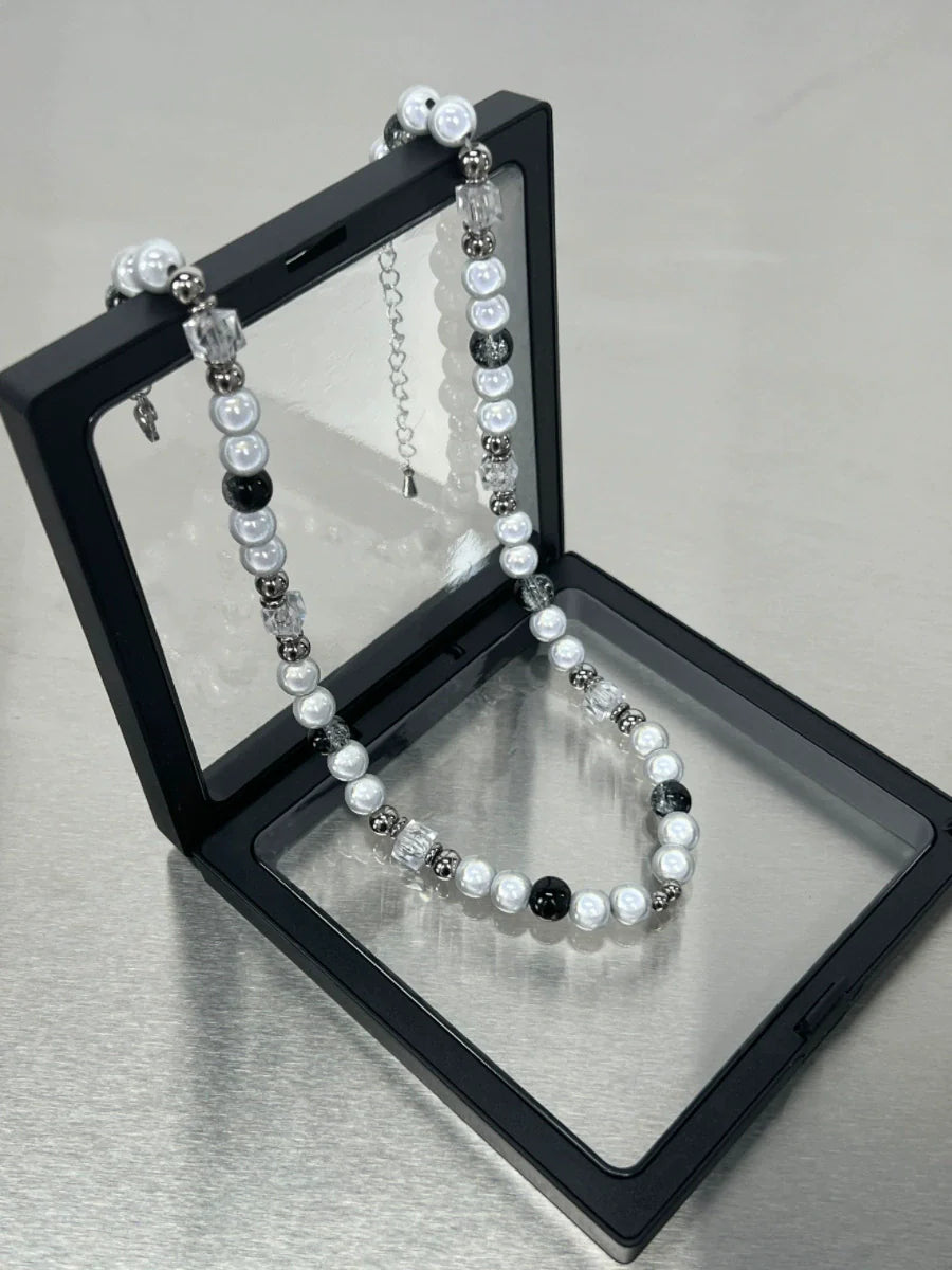 Elevate your style with the MINBIN Faux-Pearl Necklace, featuring a stunning blend of white and black pearls complemented by cube and bead detailing.