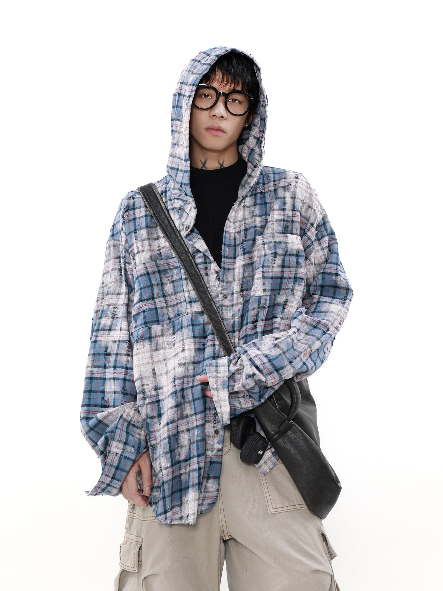 MRNEARLY Distressed Horizon Flannel Jacket with Hood