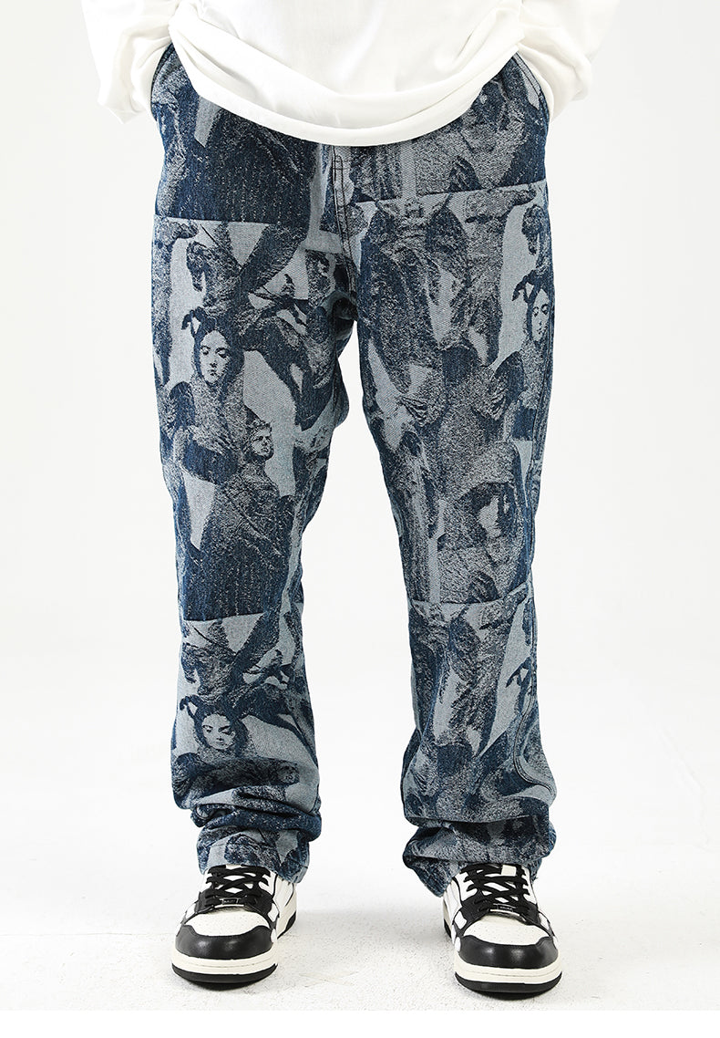 Introducing the NOSAW Denim Jeans—a perfect blend of style and comfort. Featuring a unique paneled construction and an eye-catching renaissance pattern, these jeans are designed to make a statement.