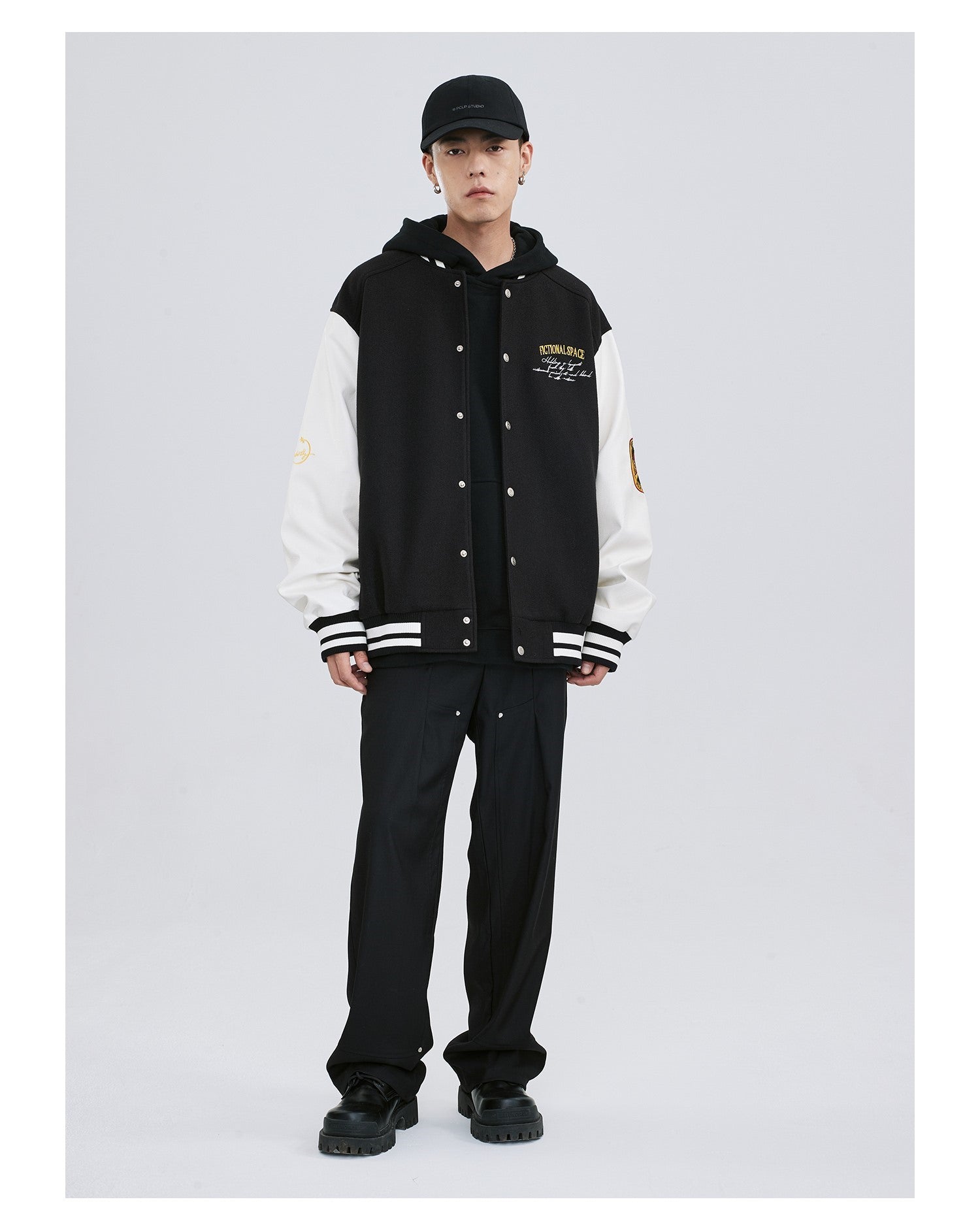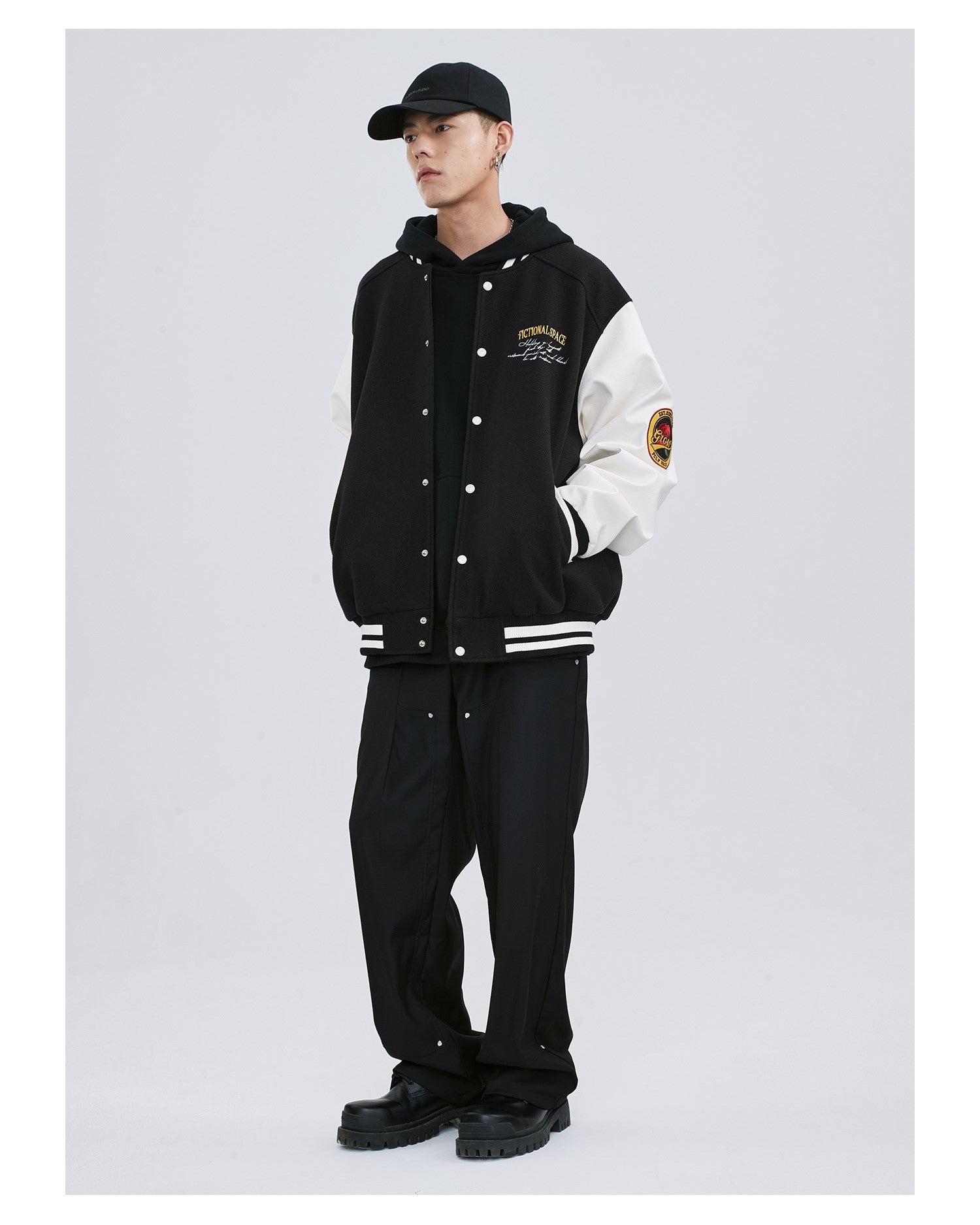 Elevate your style with our PCLP wool-blend and matte leather bomber jacket. Featuring stripes at the rib knit stand collar, hem, and cuffs, this jacket combines classic design with modern flair.