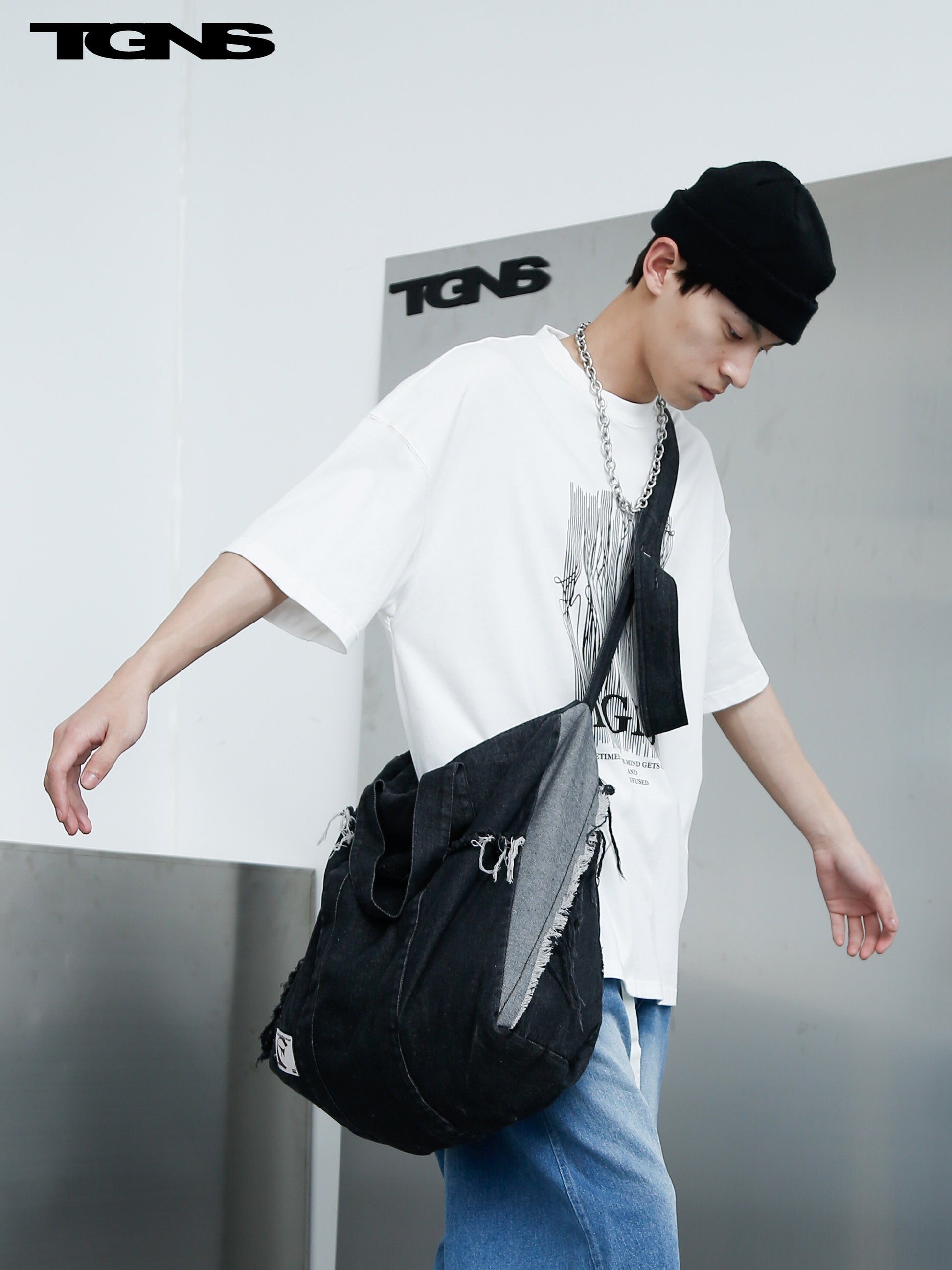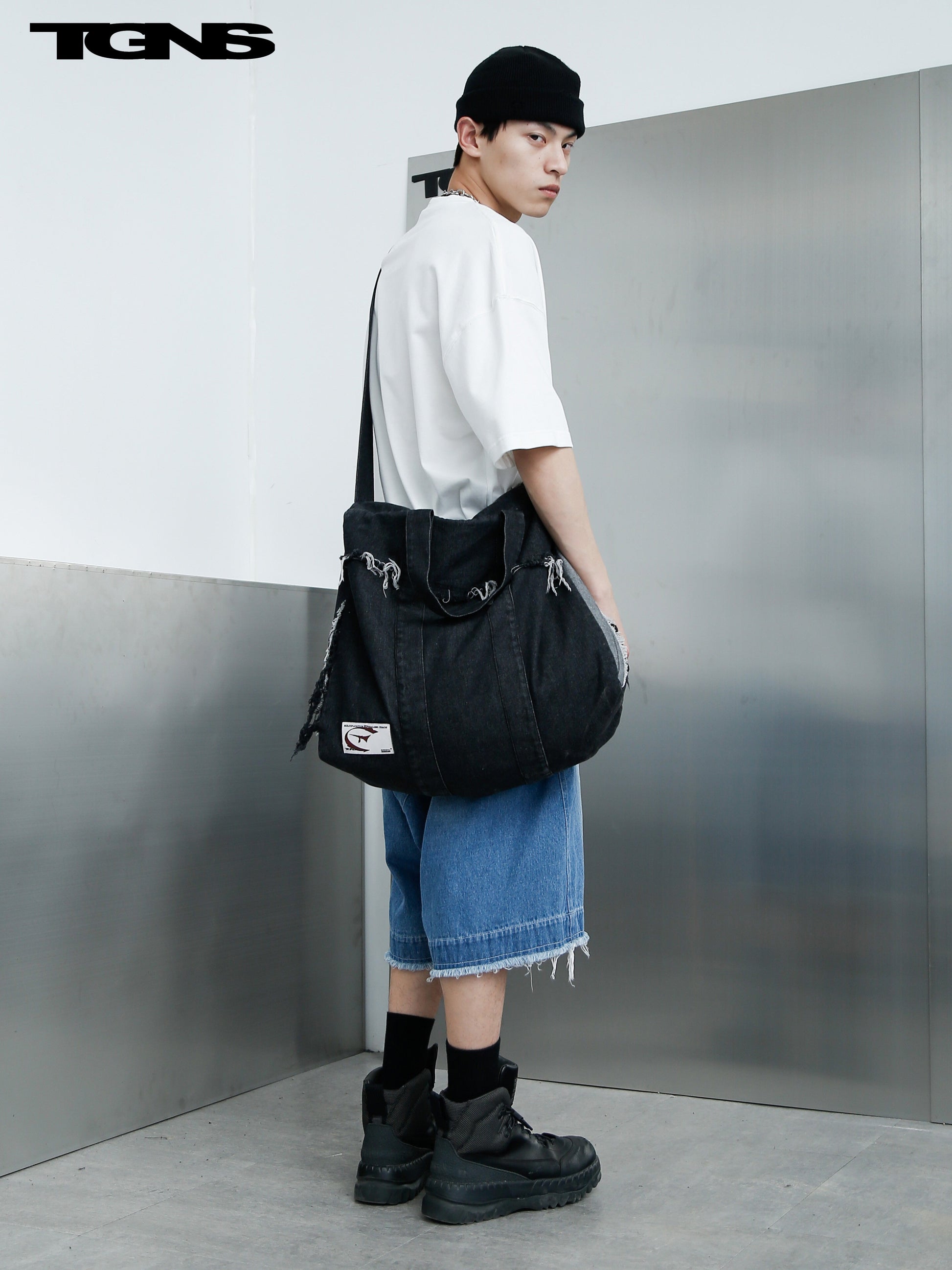 Introducing the TGNS Washed Denim Messenger Bag – a perfect blend of style and functionality. Crafted from high-quality cotton, this bag features unique raw edges and distressing for a trendy, vintage look.